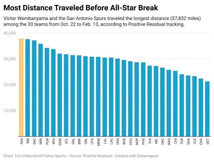 全明星前旅行最远距离:根据Positive Residual的追踪,文班亚马和马刺从1022日到213日之间,旅行的总距离(37,852英里)在30支球队中排名第一。