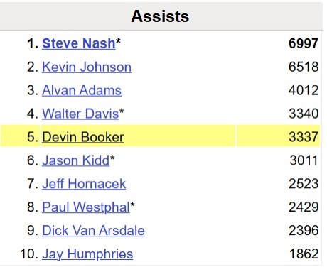 这样一来,布克太阳生涯助攻数达到3341,超越沃尔特-戴维斯升至队史第4。