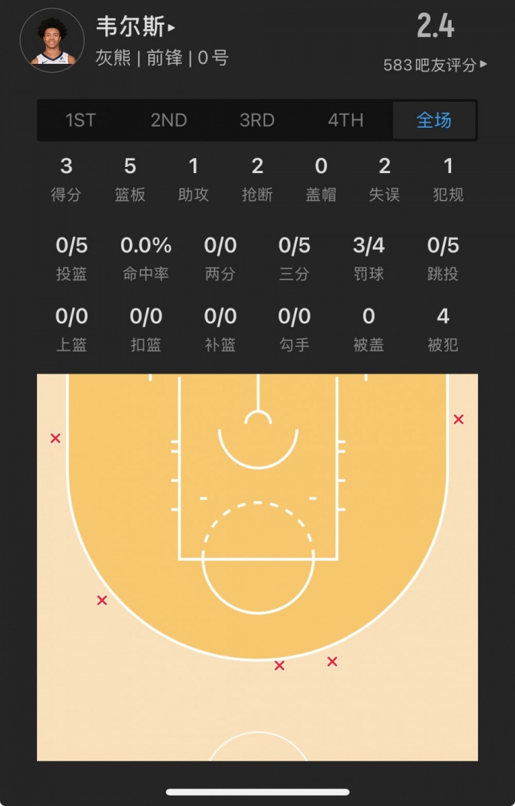 灰熊39号秀 杰伦-韦尔斯 登场25.8分钟