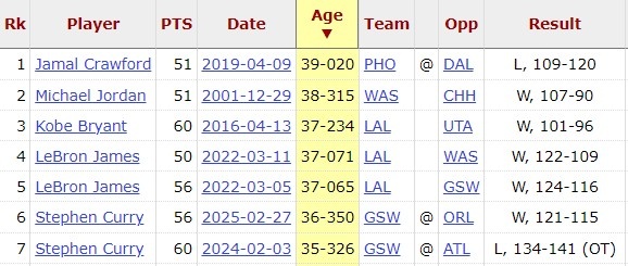据统计,哈登以35岁零191天的年纪,成为NBA历史上第8老的50分先生。