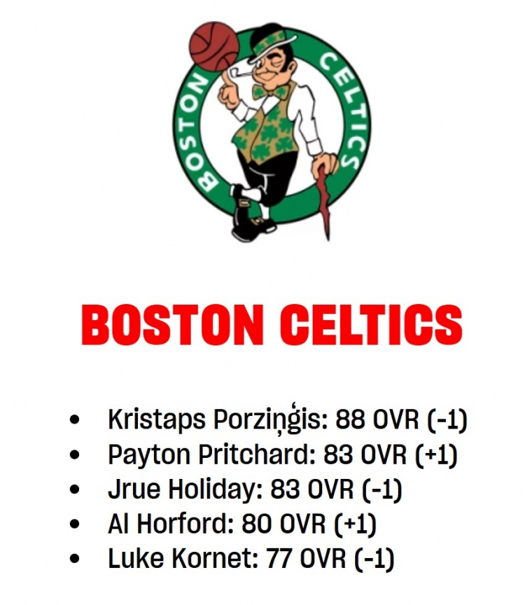 3月7日讯 NBA 2K官网更新了凯尔特人球员的能力值情况,其中,波尔津吉斯、霍勒迪和科内特下降,普理查德和霍福德上升,详情如下: