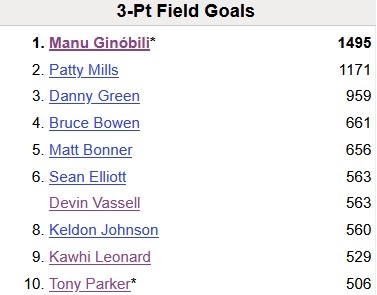 瓦塞尔马刺生涯三分数超越埃利奥特 独占队史第6位&马努高居榜首
