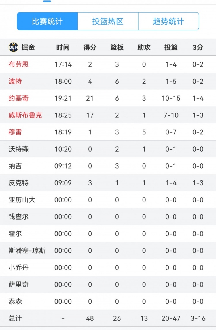 都是卧底?掘金全队除约基奇和威少外合计22投3中 穆雷7中0