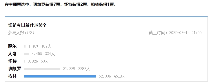 在主播票选中,班凯罗获得7票,怀特获得2票,格林获得1票。