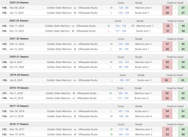 至此,勇士本赛季双杀了雄鹿。而他们上一次在常规赛双杀雄鹿,还要追溯到2016-17赛季。