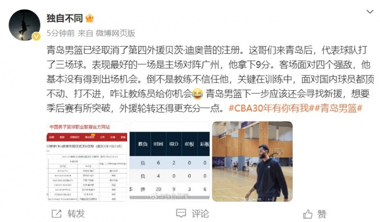 杜金城在个人微博上写道:“青岛男篮已经取消了第四外援贝茨-迪奥普的注册。这哥们来青岛后,代表球队打了三场球。表现最好的一场是主场对阵广州,他拿下9分。客场面对四个强敌,他基本没有得到出场机会。倒不是教练不信任他,关键在训练中,面对国内球员都顶不动、打不进,咋让教练员给你机会。青岛男篮下一步应该还会寻找新援,想要季后赛有所突破,外援轮转还得更充分一点。”