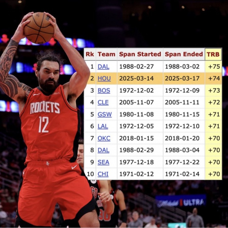 据统计,火箭能在3场比赛区间里比对手多抢74个篮板,历史第2多,仅次于1988年的独行侠(75个)。