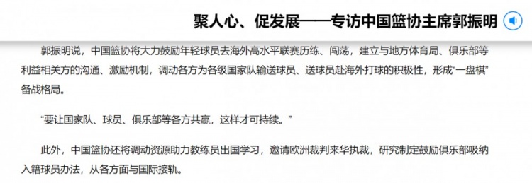 3月25日讯 篮协主席郭振明近日接受了新华社的专访,谈到了多个话题。其中一点,他表示中国篮协将大力鼓励年轻球员去海外高水平联赛历练、闯荡。