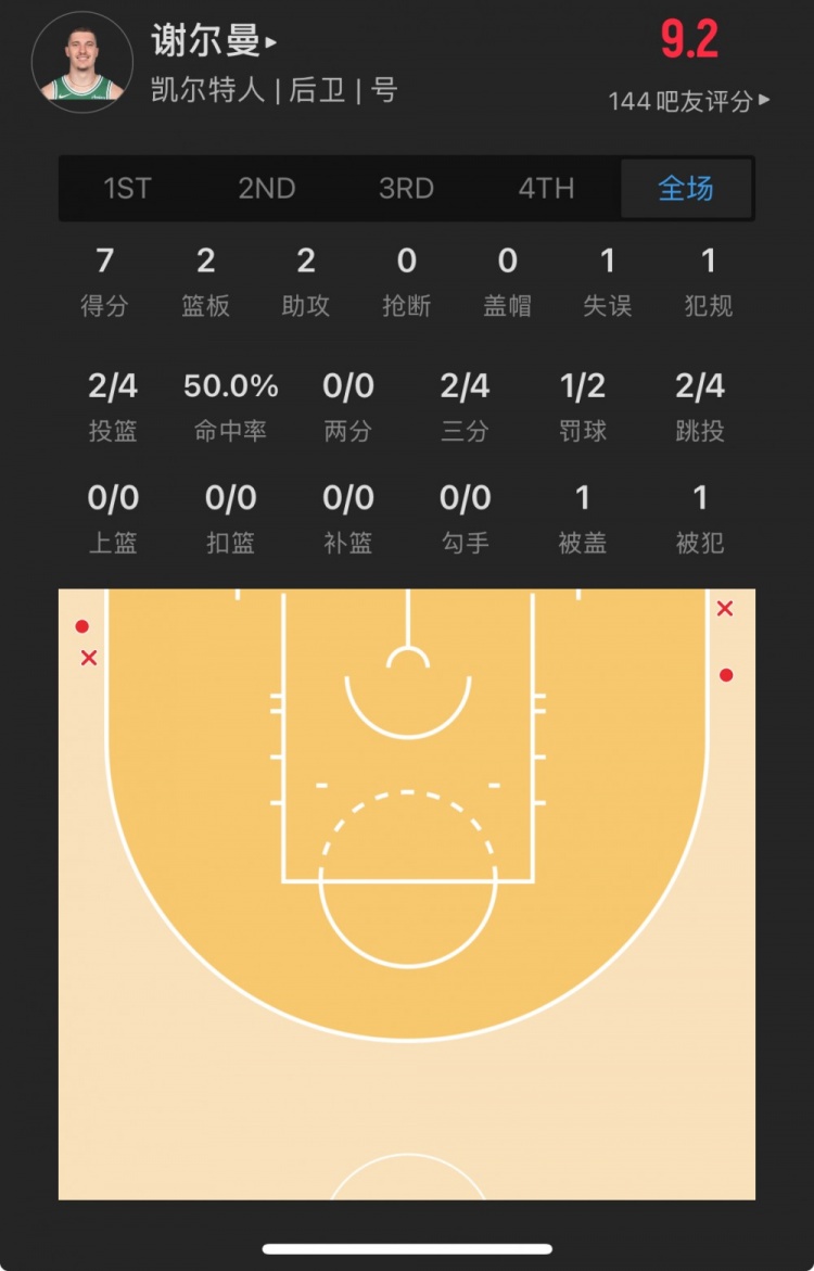 凯尔特人30号秀 贝勒-谢尔曼 登场19.0分钟