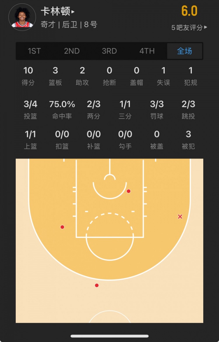 奇才14号秀 卡尔顿-卡林顿 登场21.6分钟