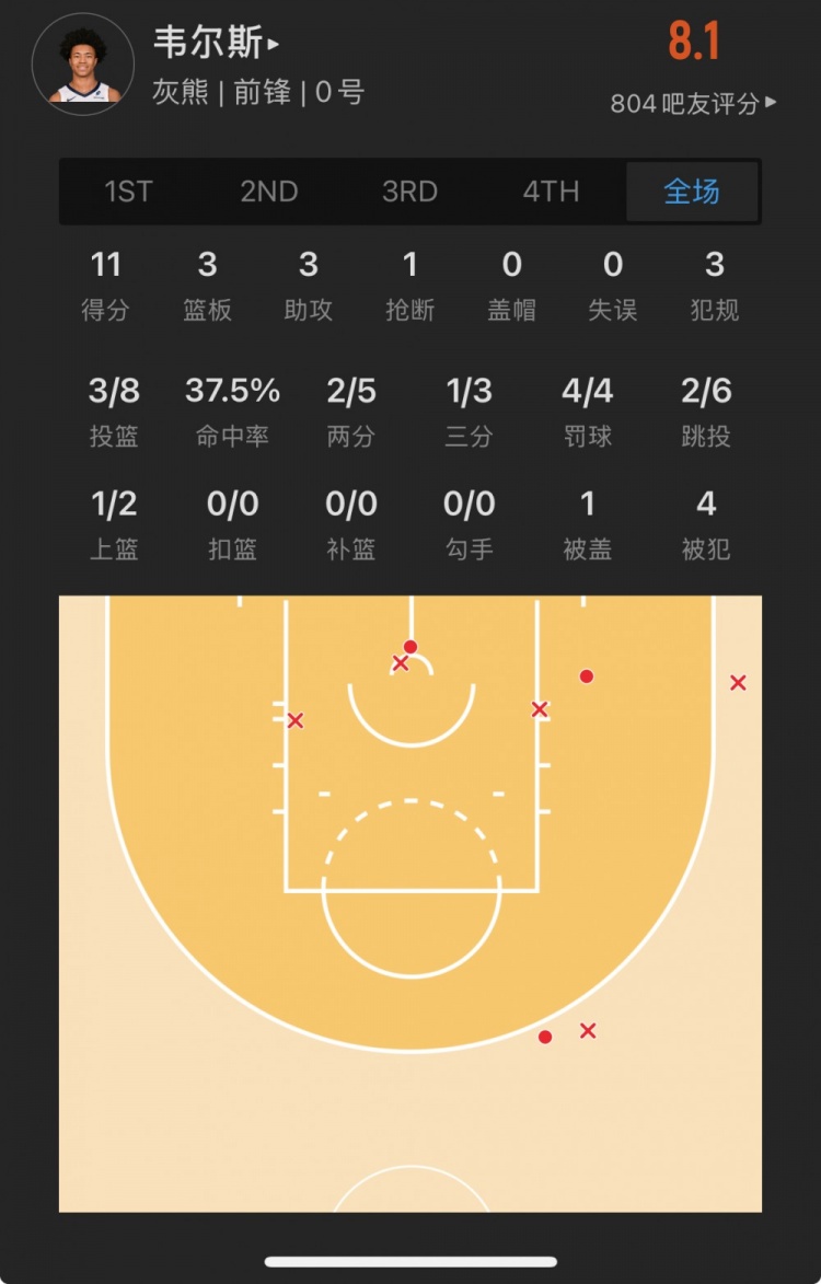 灰熊39号秀 杰伦-韦尔斯 登场23.6分钟