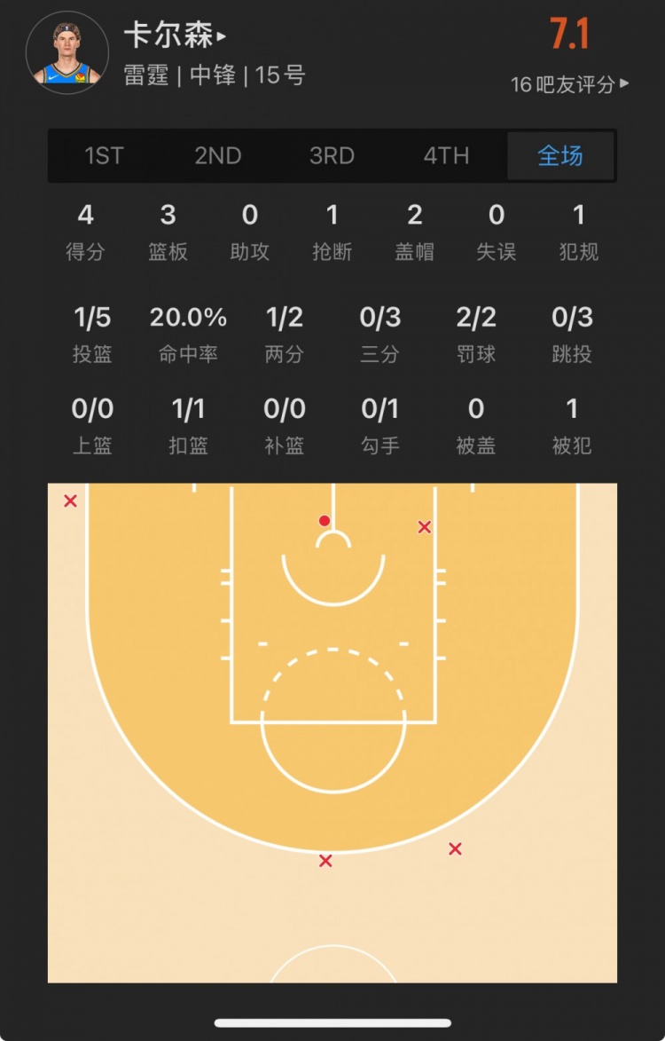雷霆落选秀 布兰登-卡尔森 登场12.6分钟