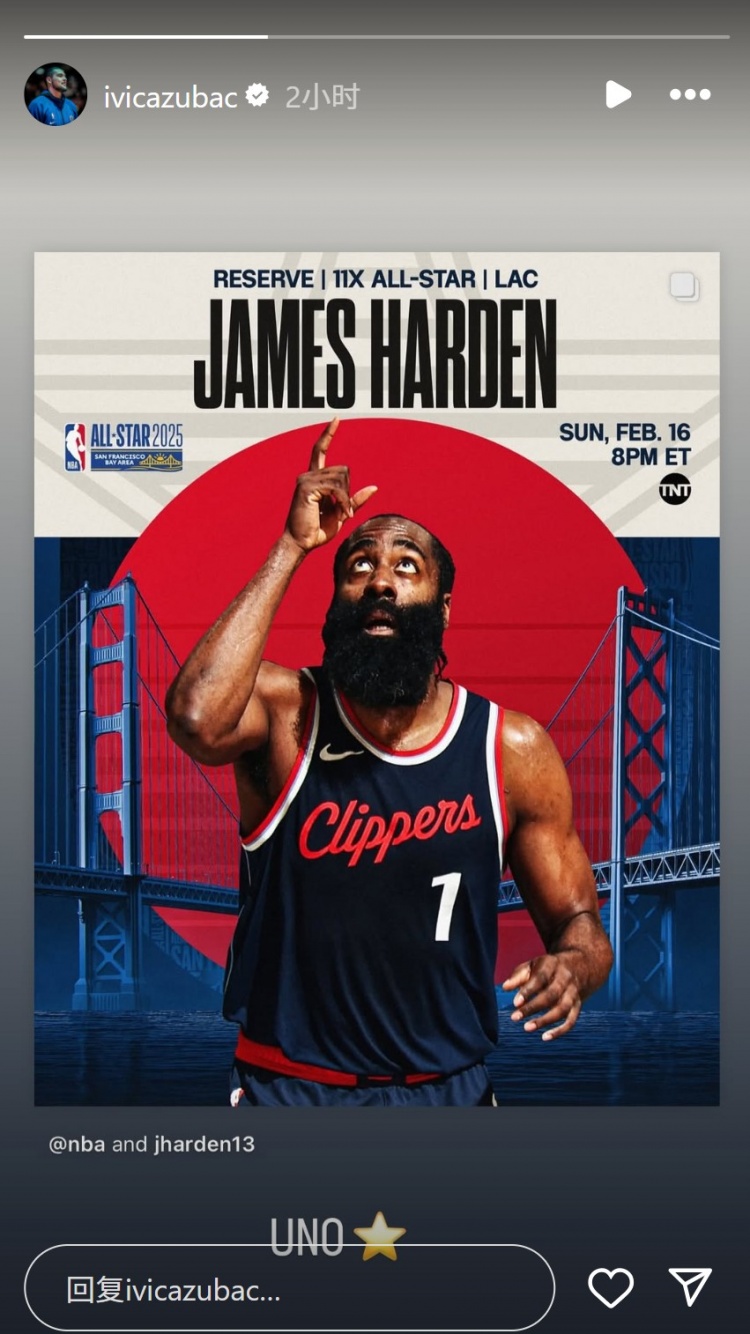 老大哥哈登入选全明星!祖巴茨转发相关动态:UNO⭐ 1月31日讯 NBA官方今日公布了全明星替补阵容,哈登入选西部替补。队友祖巴茨在INS上转发了相关动态,写道:“UNO⭐”注:哈登个人标签“UNO”是“1”的意思,也是“Under No One”的 2025/01/31