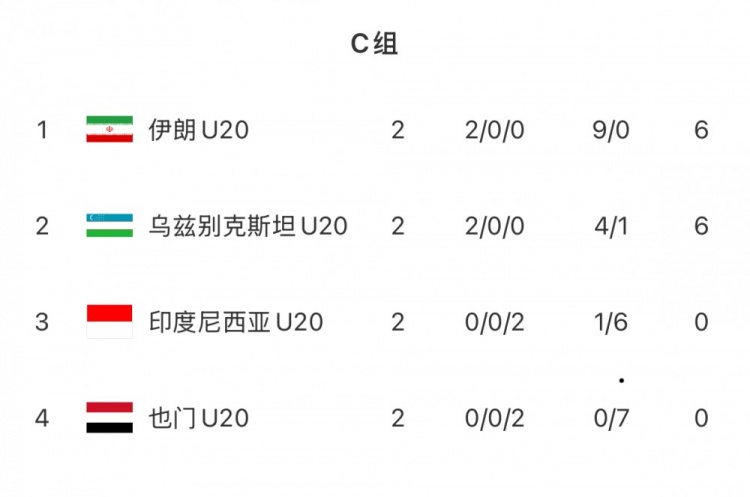 小组赛两轮战罢,乌兹别克斯坦U20队两战全胜提前晋级8强,他们末轮将与伊朗U20队争夺小组头名,也门U20队和印尼U20队出局。