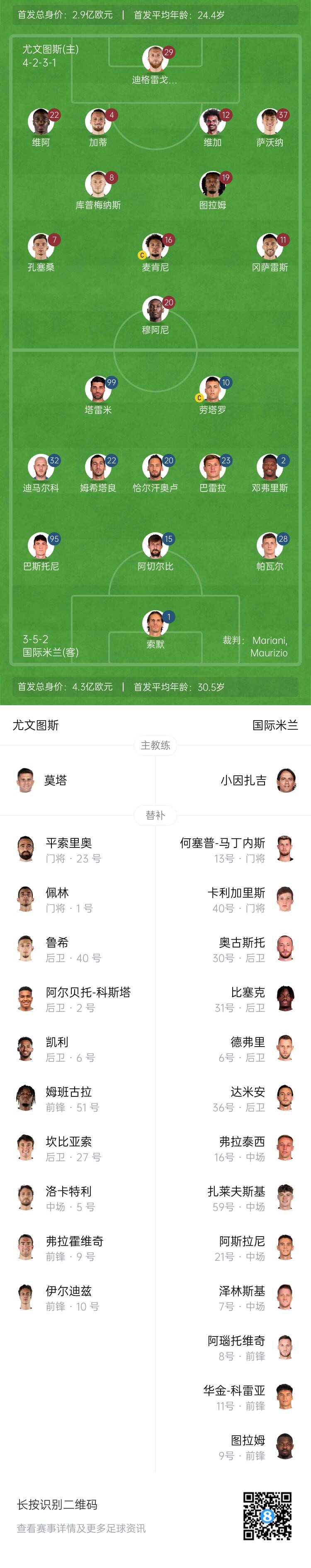 2月17日讯 意甲第25轮,尤文主场对阵国米。赛前,官方公布了本场的首发名单。
