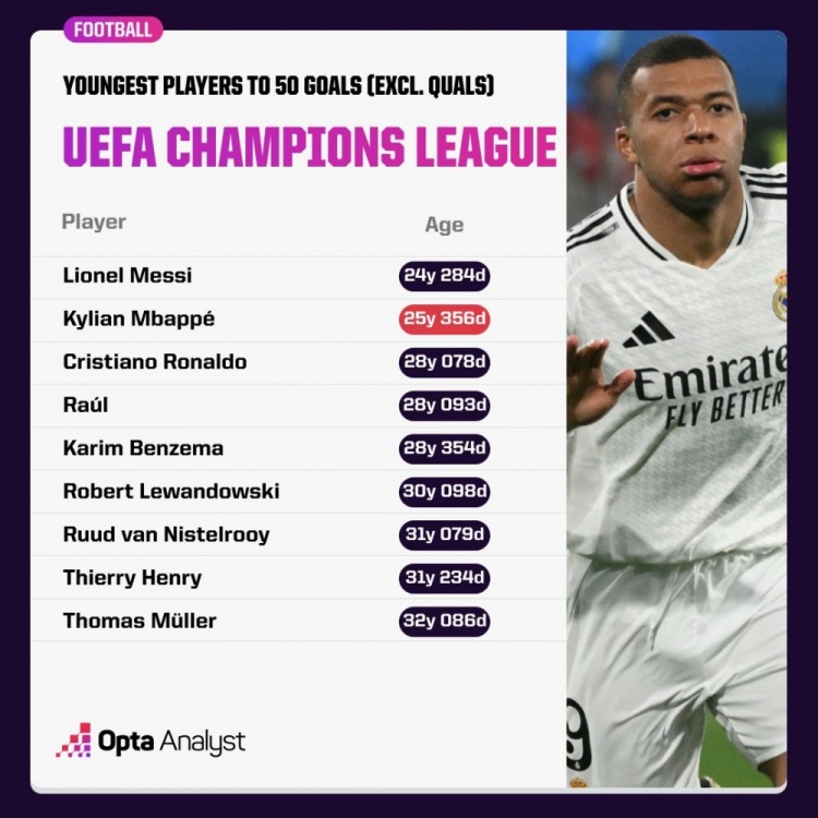 欧冠正赛50球最年轻球员排行: