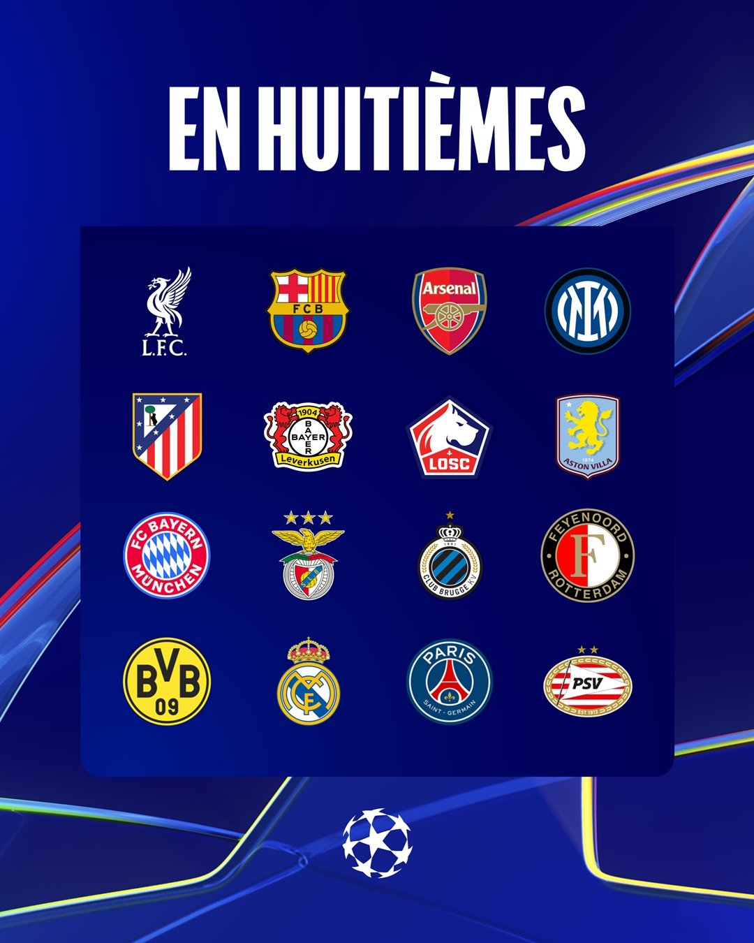 附加赛晋级8队:本菲卡、拜仁慕尼黑、费耶诺德、布鲁日、多特蒙德、巴黎圣日耳曼、皇家马德里、埃因霍温