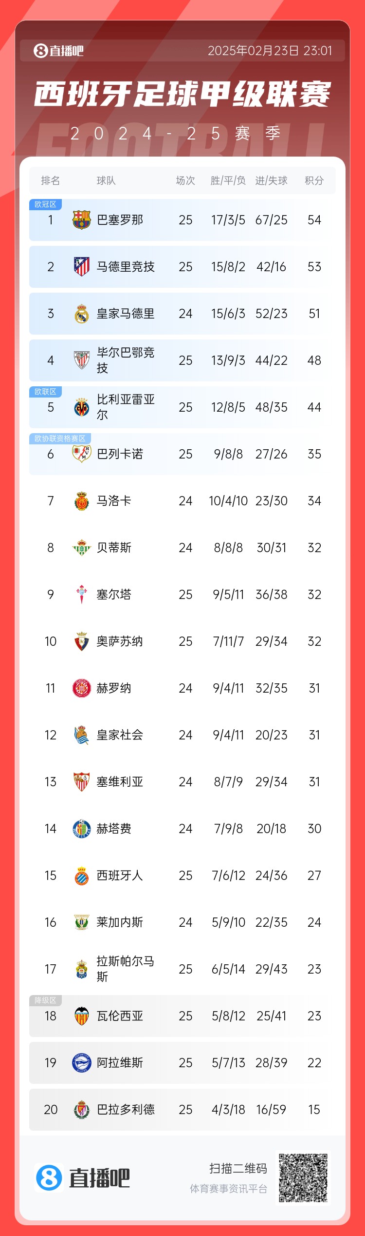 西甲积分榜↓