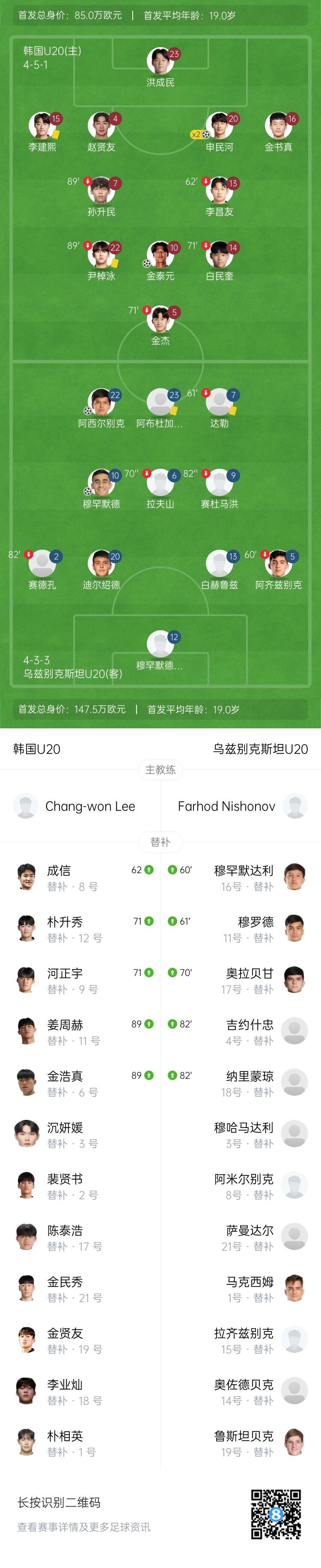 90分钟战报-U20韩国3-3乌兹别克斯坦进加时 阿布杜加富尔绝平