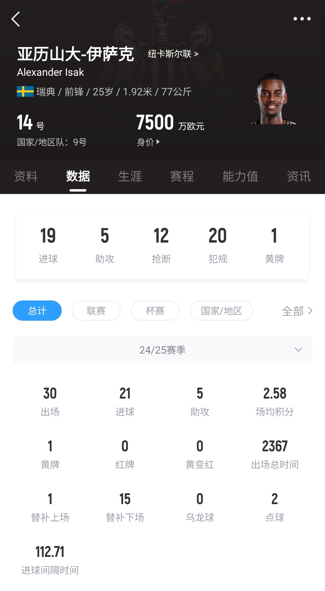 2022年夏窗纽卡花费7000万欧签下球员。本赛季25岁的伊萨克为纽卡出战30场比赛,打进21球并有5次助攻,目前球员德转身价7500万欧。