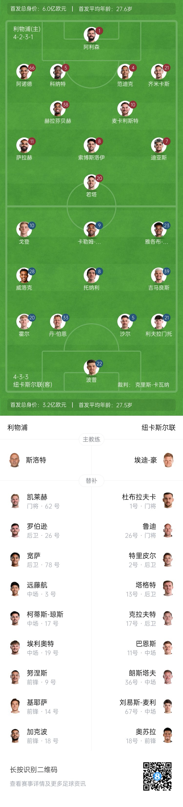 利物浦首发:1-阿利森、21-齐米卡斯、4-范迪克、5-科纳特、66-阿诺德、38-赫拉芬贝赫、8-索博斯洛伊、10-麦卡利斯特、7-迪亚斯、11-萨拉赫、20-若塔