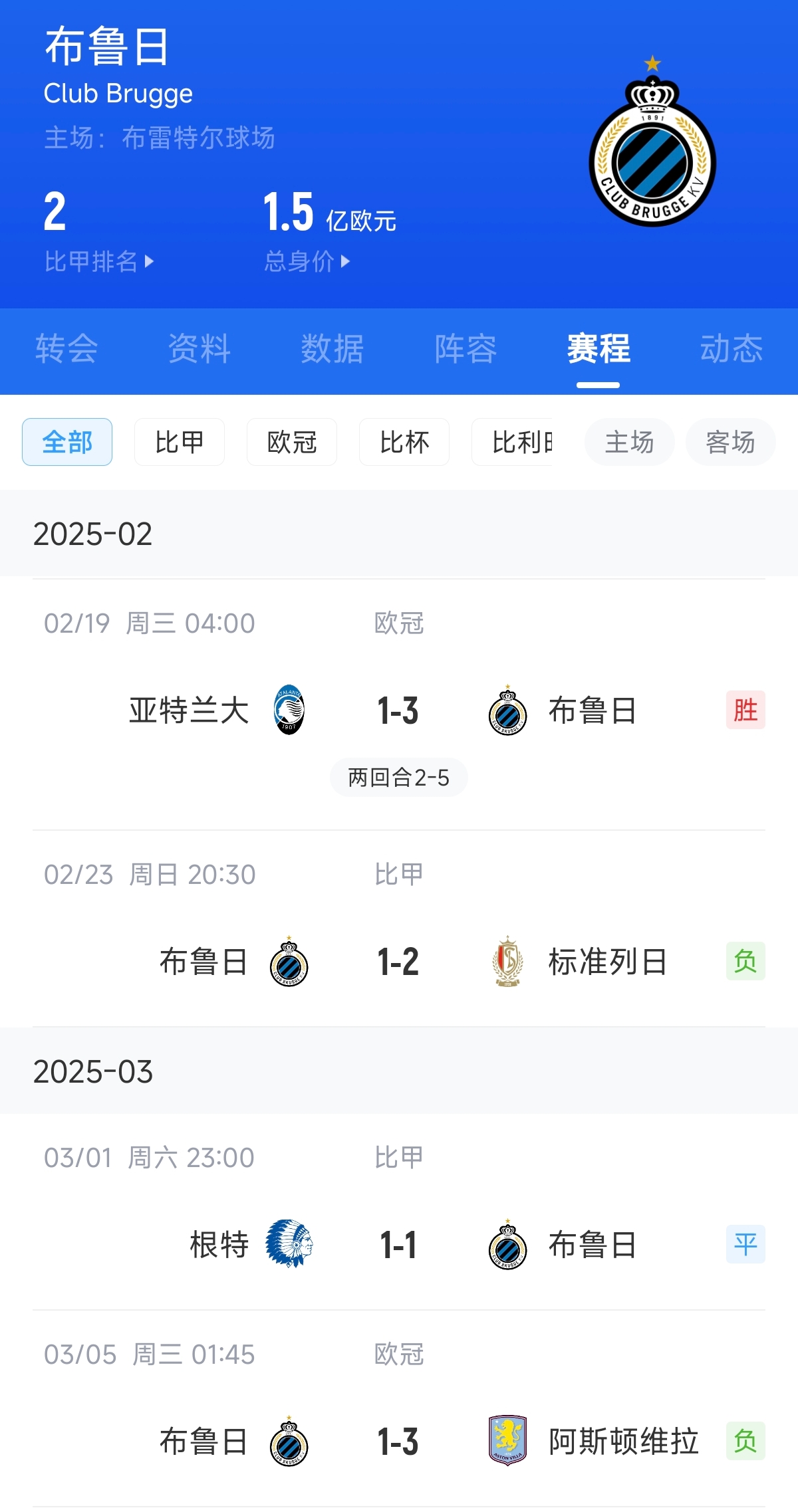 2月23日比甲布鲁日1-2不敌标准列日,3月1日比甲布鲁日1-1战平根特,距离榜首亨克9分。3月5日凌晨,布鲁日1-3不敌阿斯顿维拉。
