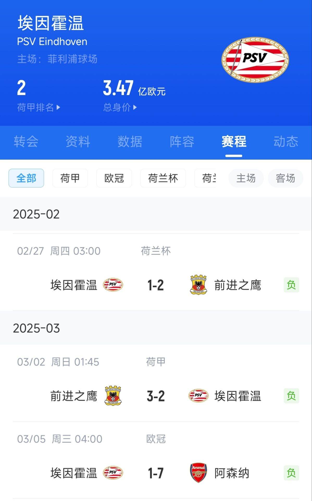 6天前的2月27日,埃因霍温荷兰杯半决赛1-2不敌前进之鹰,无缘决赛。3天前的荷甲联赛,埃因霍温2-3被前进之鹰双杀,荷甲再丢3分,距离榜首阿贾克斯已有8分差距。今天凌晨,埃因霍温欧冠遭遇惨败,出局几乎板上钉钉。