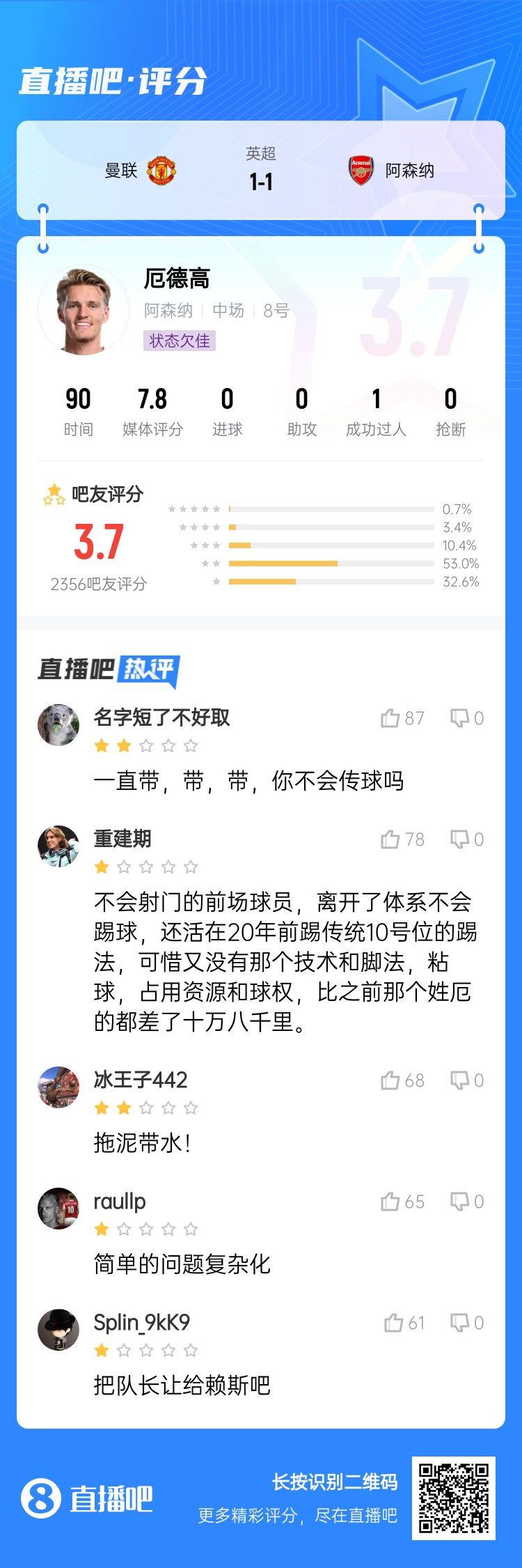 英超第28轮,阿森纳客场1-1战平曼联。厄德高本场比赛首发踢满全场,发挥糟糕。
