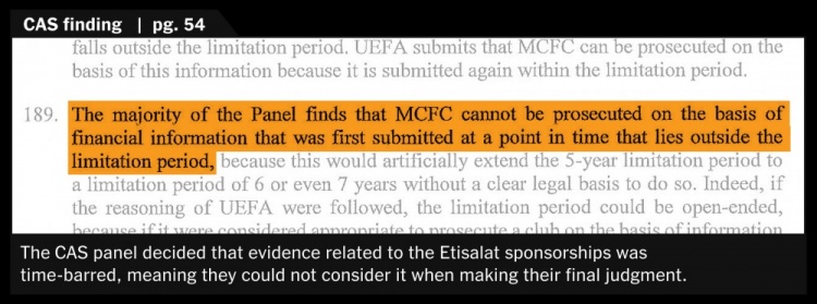 在CAS审理过程中,尽管最初曼城被认定违规,但上诉委员会发现,他们无法确保这些所谓的阿联酋电信付款的合法性——因为它们已经超过时效了。不过根据TA咨询的法律专家表示,这对于英超联赛处罚并不会造成阻碍。