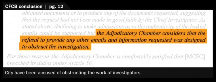CAS判决中显示,曼城未能提供相应的证据,确实阻碍了CFCB的调查。