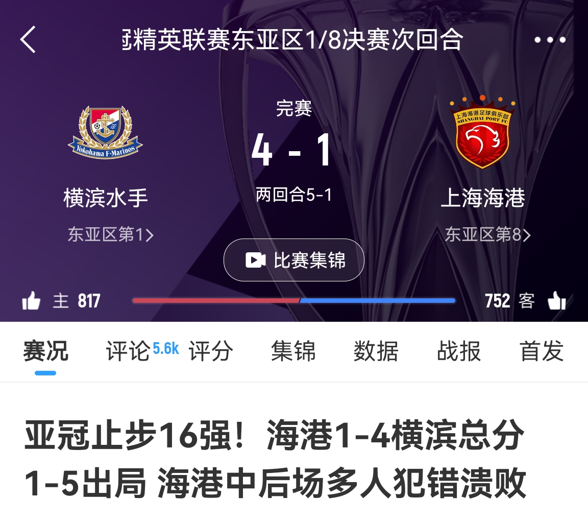 昨天的比赛中,海港客场1-4惨败横滨,总比分1-5遭淘汰。