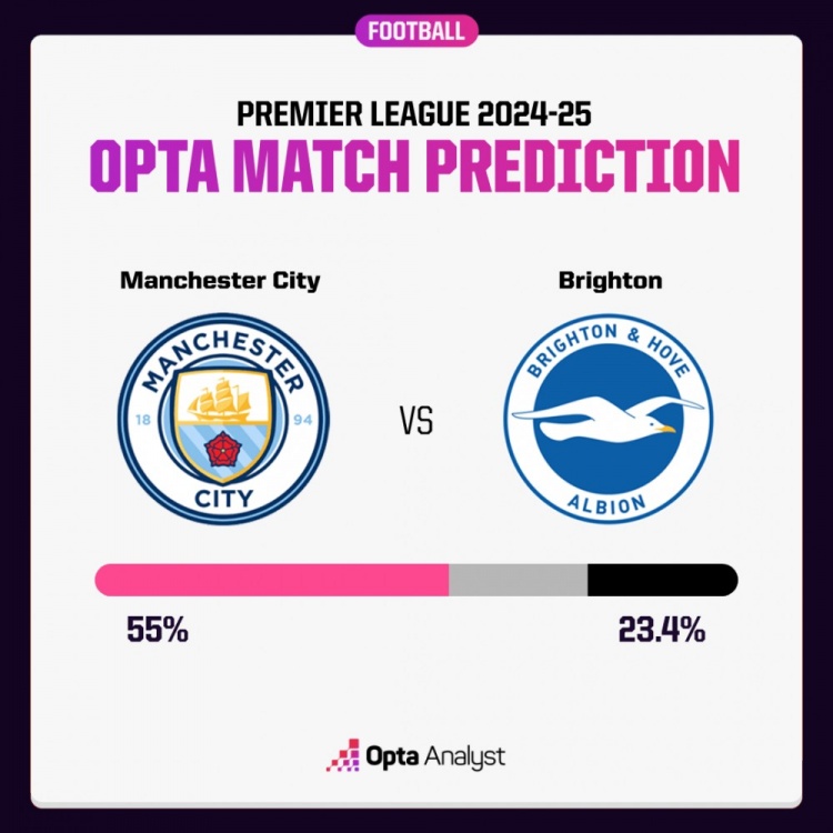 Opta对于本场比赛进行了超级计算机模拟预测,曼城获胜概率55%,布莱顿获胜概率23.4%,双方战平概率21.7%。