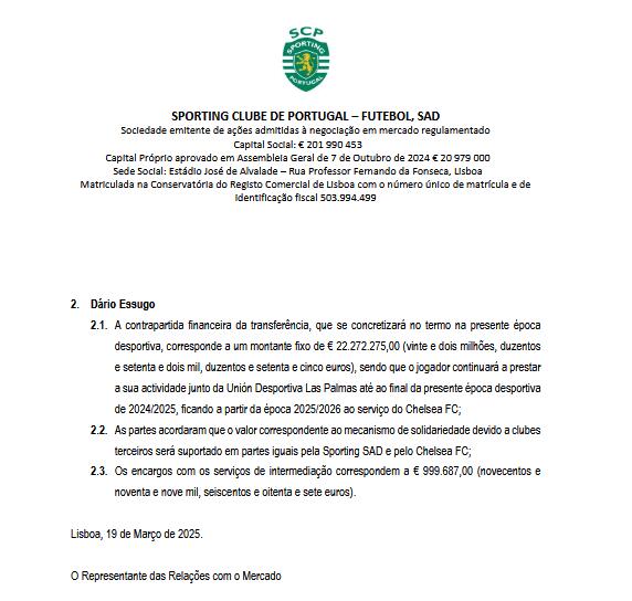 埃苏戈转会费为22272275.00欧元(约2227万欧),将在本赛季结束时支付。球员将继续为拉斯帕尔马斯效力至2024/2025赛季结束,并从2025/2026赛季开始为切尔西效力。