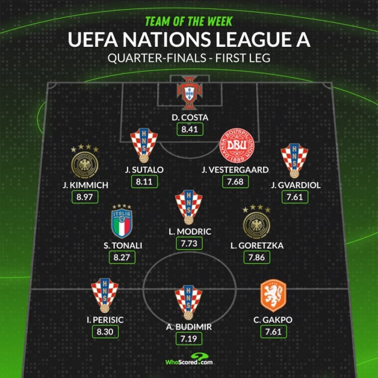 3月21日讯 欧国联A级别八强战首回合已经完赛,whoscored也列出了本轮评分最佳阵容,克罗地亚5将在列。