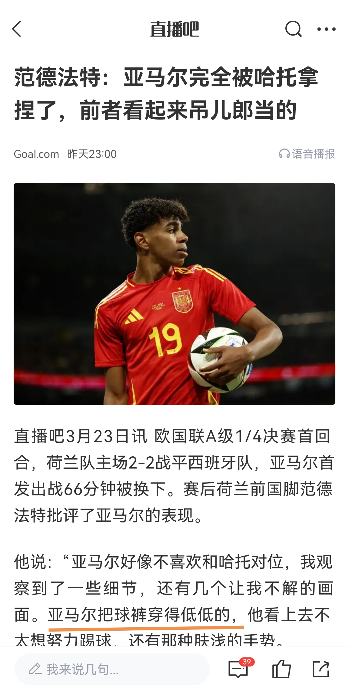 亚马尔的这一动作显然是有意为之。就在这场比赛前,荷兰名宿范德法特批评了亚马尔在首回合的表现,甚至认为亚马尔“亚马尔把球裤穿得低低的,他看上去不太想努力踢球,还有那种肤浅的手势”。