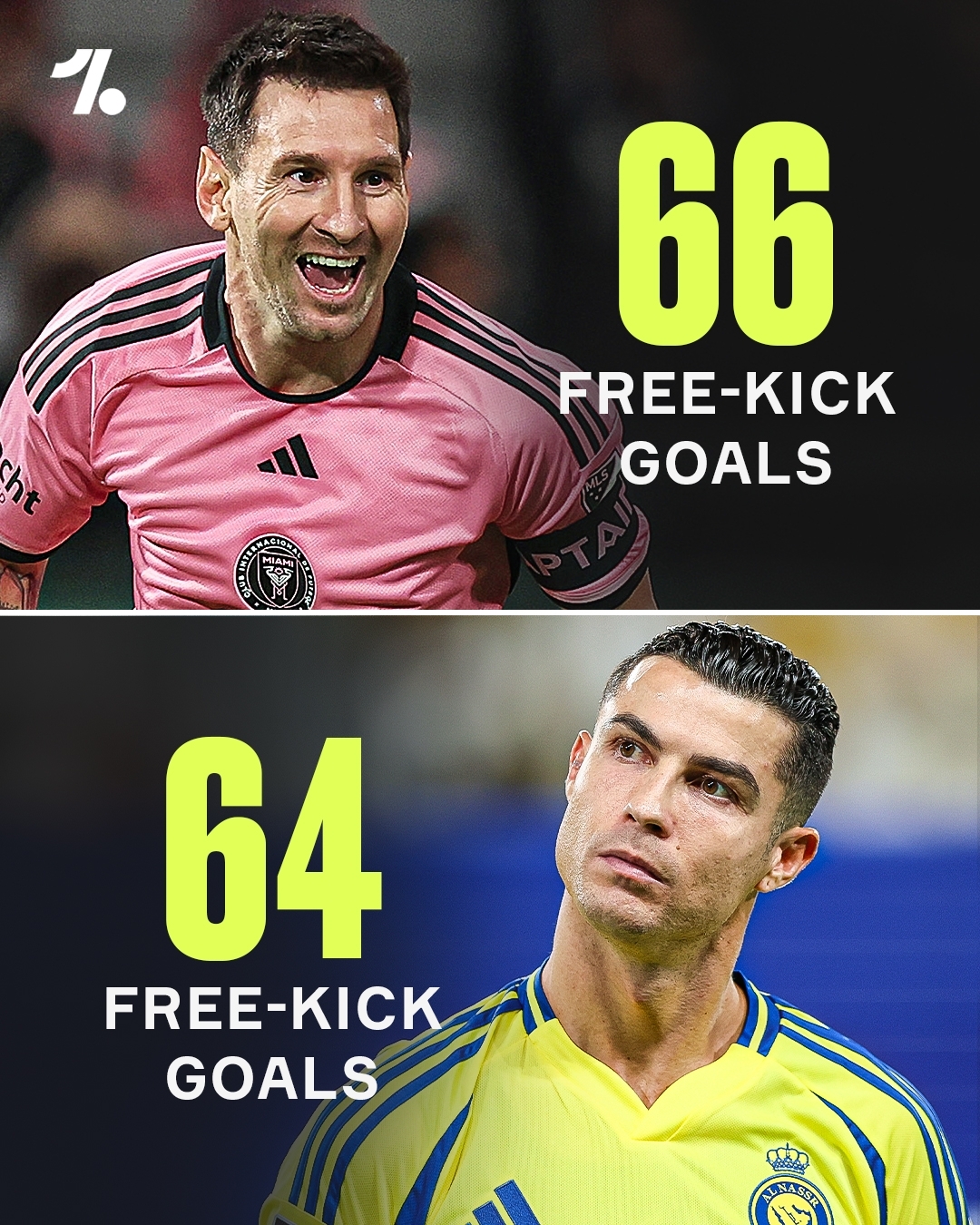 而梅西和C罗职业生涯至今分别打进了66粒任意球和64粒任意球。