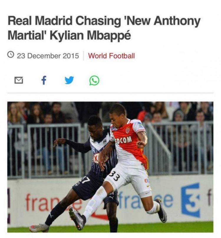 考古报道:2015年12月,皇马追逐“新马夏尔”——基利安-姆巴佩