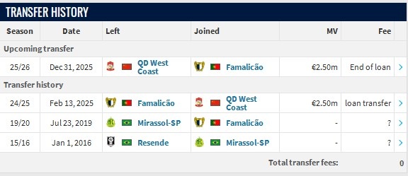 2月14日讯 德国《转会市场》更新了巴西后卫里切利的信息,网站显示里切利在2月13日正式由葡超法马利康租借加盟青岛西海岸。