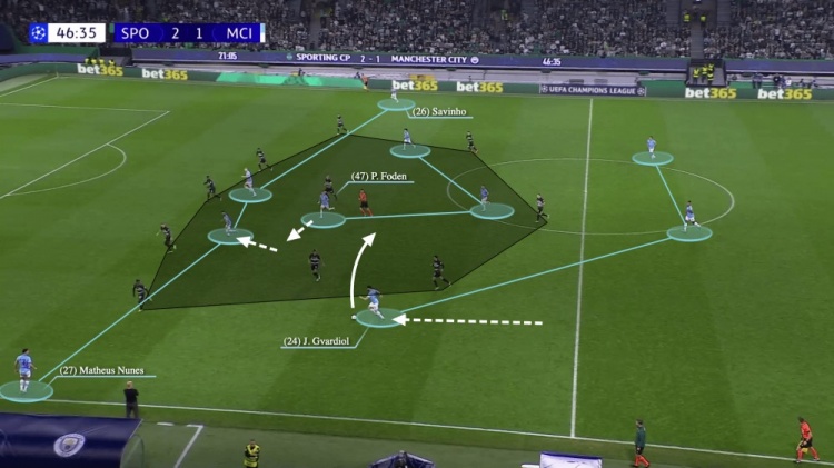 最明显的例子是对阵葡萄牙体育的比赛。曼城在下半场一开始就失误了,一个简单的二过一足以让贡萨尔维斯从他们的中场身后进入。他传球给边后卫马克西米利亚诺-阿劳霍,然后皮球越过了埃德森把守的大门。阿劳霍破门后仅86秒,葡萄牙体育就获得了一个点球。从开球开始,曼城就立即转变为3-1-3-3阵型来对阵葡萄牙体育的五后卫。阿坎吉将球传给了格瓦迪奥尔,后者在理论上来说是有足够向前推进的空间。