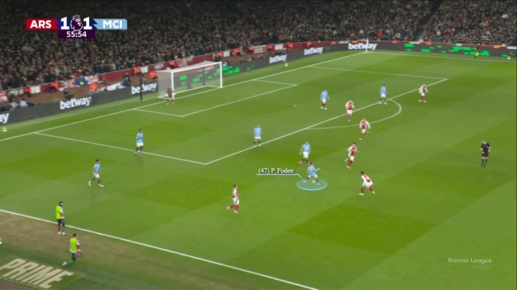 福登、萨维尼奥,再加上曼城的三名中场球员,他们在球门附近有太多的球员,使得他们很难长传球调度(哈兰德在中线附近,没有出现在这个镜头中)。