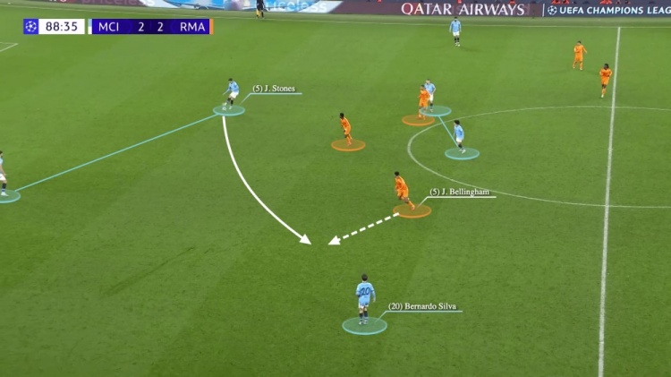甚至在对阵皇马的比赛中,此前一直很可靠的斯通斯,也出现了失误。他在比赛中扮演6号角色,在开局后移动到了左中后卫的位置上。他传球给贝尔纳多-席尔瓦,就不是一个合适的选择。贝林厄姆拦截了这次传球,并带球向前推进,贝尔纳多-席尔瓦在禁区外将其包夹,但这一次并没有判罚。