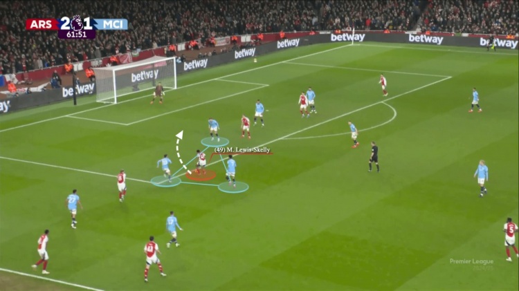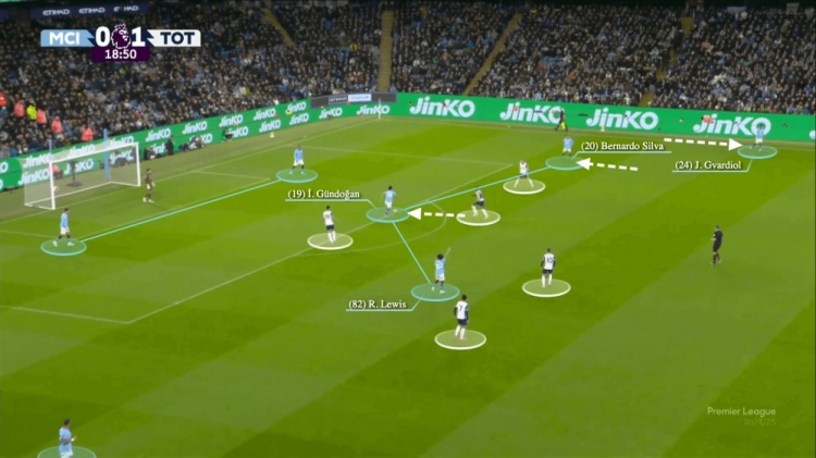 曼城的三名中场球员——里科-刘易斯、贝尔纳多-席尔瓦和京多安——都已经回收到了禁区附近,京多安将球带到了禁区边缘。贝尔纳多-席尔瓦和格瓦迪奥尔则在边路活动。