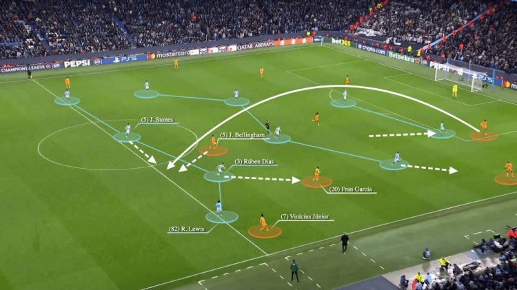 理想情况下,斯通斯和鲁本-迪亚斯会形成默契的配合。虽然鲁本-迪亚盯着弗兰-加西亚,并试图后撤,但斯通斯出现在一个更靠后的位置,使得贝林厄姆并没有被紧盯,有了一个向前的机会。
