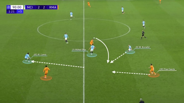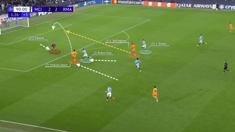 然而曼城的防守调整还是出现了失误,因为皇马用弗兰-加西亚换下了姆巴佩。皇马以短传为主,并在曼城逼抢之时改用长传推进。