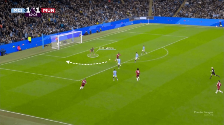 为了应对曼联的进攻,埃德森保持了一个较高的站位,但没有进一步向前采取动作。当球进入曼城禁区之后,阿玛德反应迅速,带球突破埃德森,小角度完成破门。