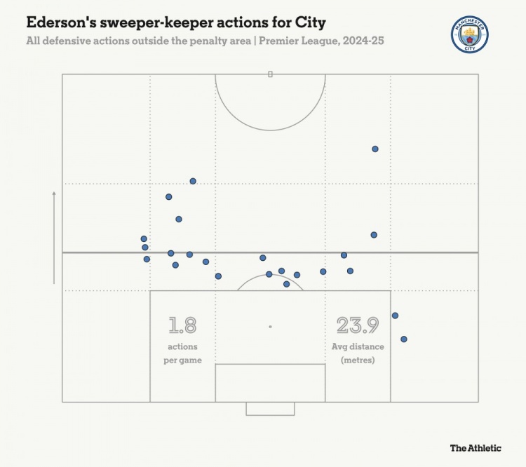 曼城的防守缺陷,使得他们对埃德森的清道夫门将属性要求更高了。他的场均1.8次扑救和23.9次的场均禁区外动作,是他自2021/2022赛季意义来最高的,当时分别为1.5次和25.3次。