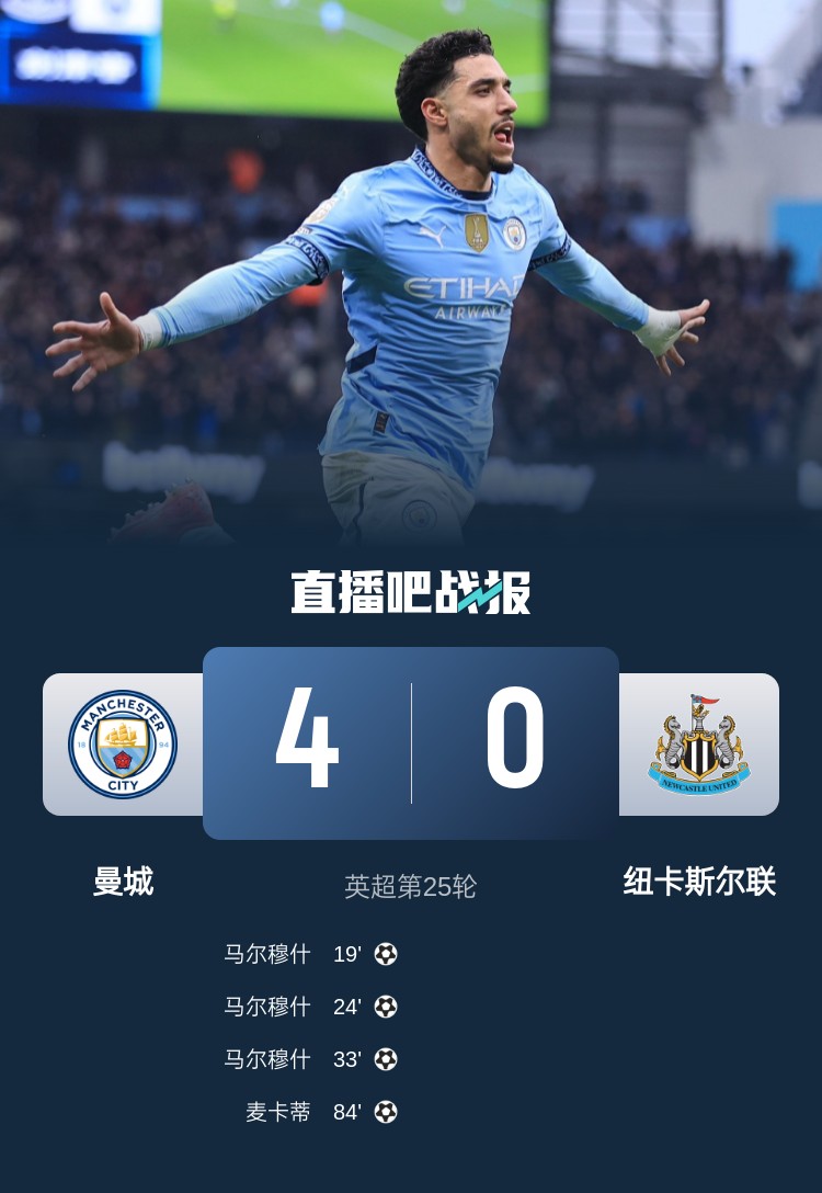 曼城本轮4-0大胜纽卡!马尔穆什戴帽!麦卡蒂打入一球。