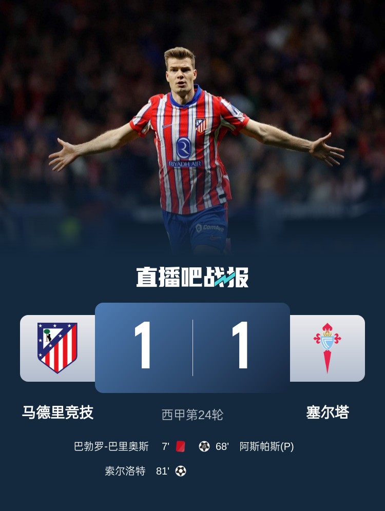 本轮西甲,马竞1-1塞尔塔,落后榜首1分。