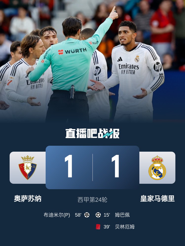判罚争议不断!皇马本轮1-1战平奥萨苏纳,姆巴佩破门,贝林厄姆染红。