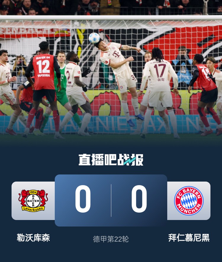 德甲本轮焦点大战,勒沃库森0-0战平拜仁。拜仁7连胜遭终结,8分领跑联赛。